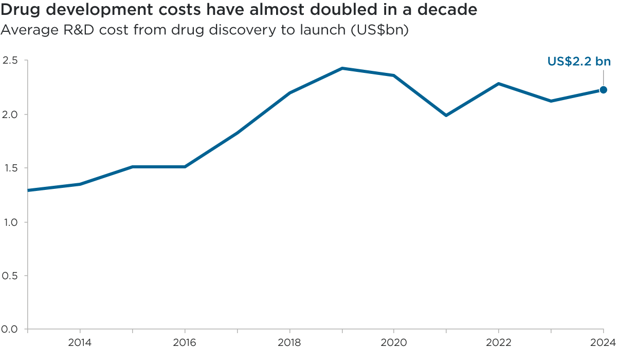 The end-to-end costs of successfully developing a new drug have increased from an average of US$1.3bn to US$2.2bn over the past decade.7 Over two-thirds of costs are incurred at the clinical trial stage, when a drug goes into human testing.