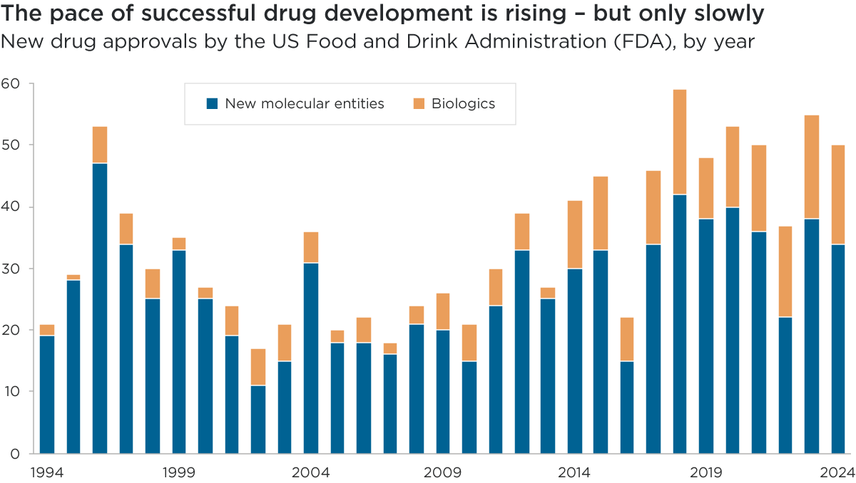 More effective, AI-led drug discovery could also bring more novel products to market. The number of new molecular entities approved by the US Food and Drug Administration (FDA) has been broadly static over the past three decades, edging up only slightly.2
