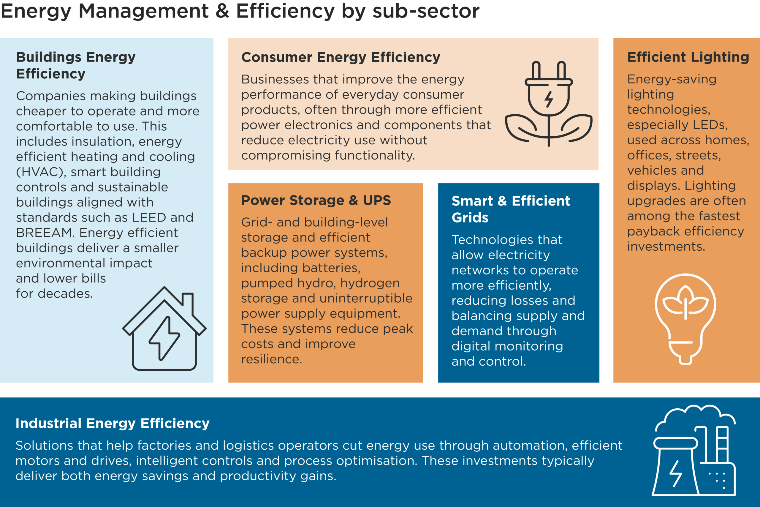 Within our Environmental Markets taxonomy, the Energy Management & Efficiency sector highlights products and services that help customers use less energy. Rather than focusing on a specific industrial sector or technology, the classification is sub-divided into six sub-sectors (below) where energy savings are measurable and repeatable.