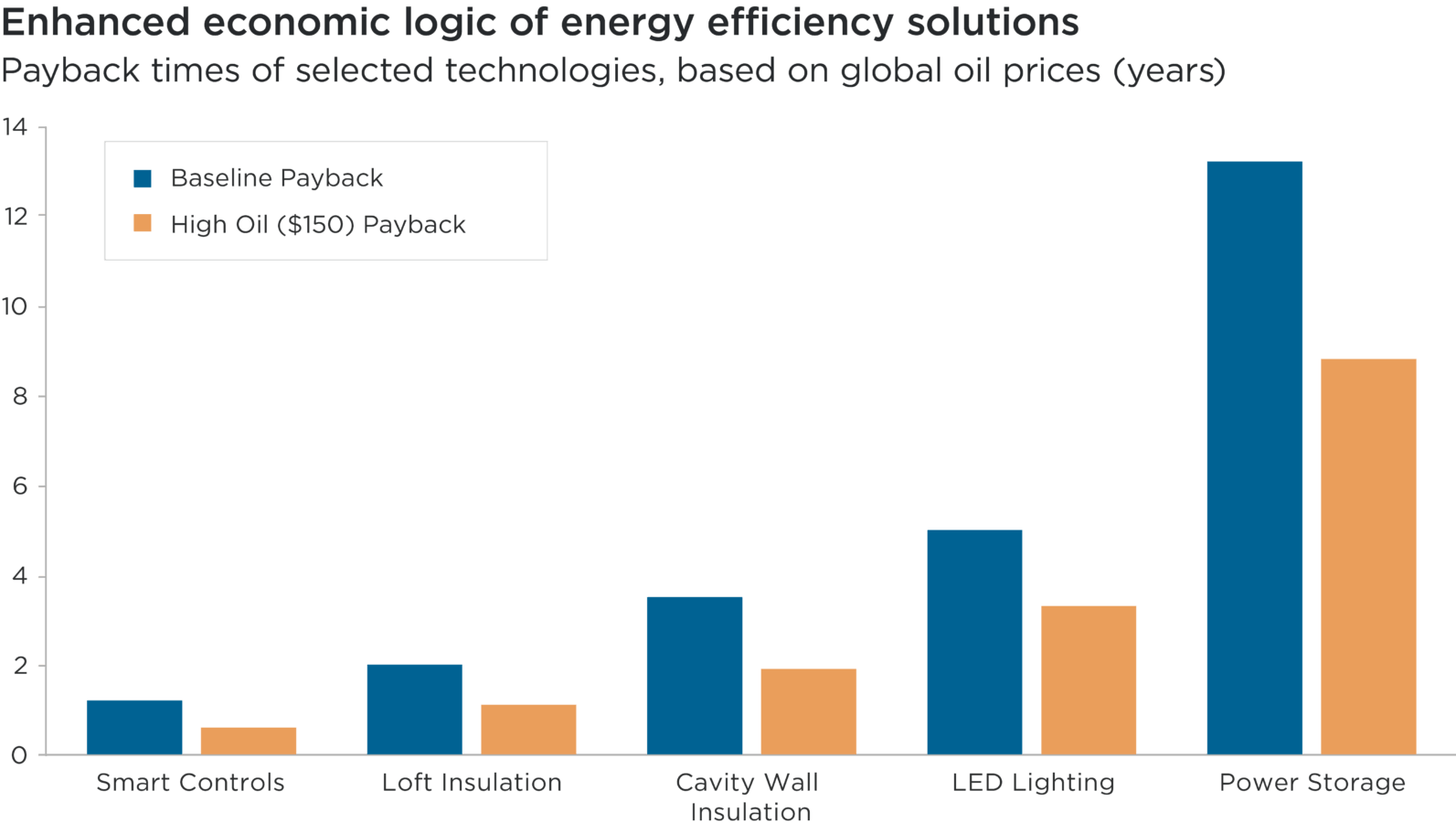 Overview: This bar chart shows the respective payback periods for selected energy management and efficiency technologies, based on baseline estimates for the UK in April 2026 and under a ‘high oil’ price scenario in which global oil prices reach US$150 a barrel.