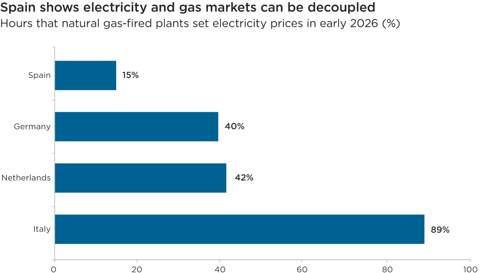 Overview: This bar chart shows the proportion of time that electricity prices were determined by the cost of natural gas-powered generation in four selected European countries – Germany, Italy, the Netherlands and Spain – in early 2026. The period covered is 1 January 2026 to 10 March 2026.