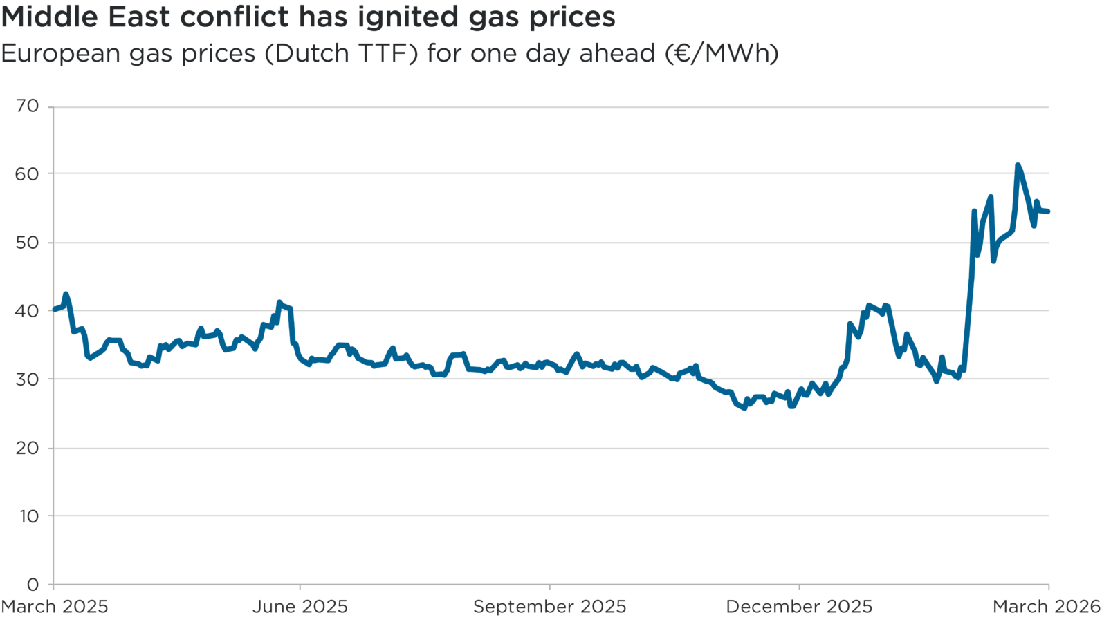 Overall, this chart illustrates how European gas prices remained relatively stable until the onset of conflict in Iran, at the end of February 2026. Prices almost doubled in March 2026.