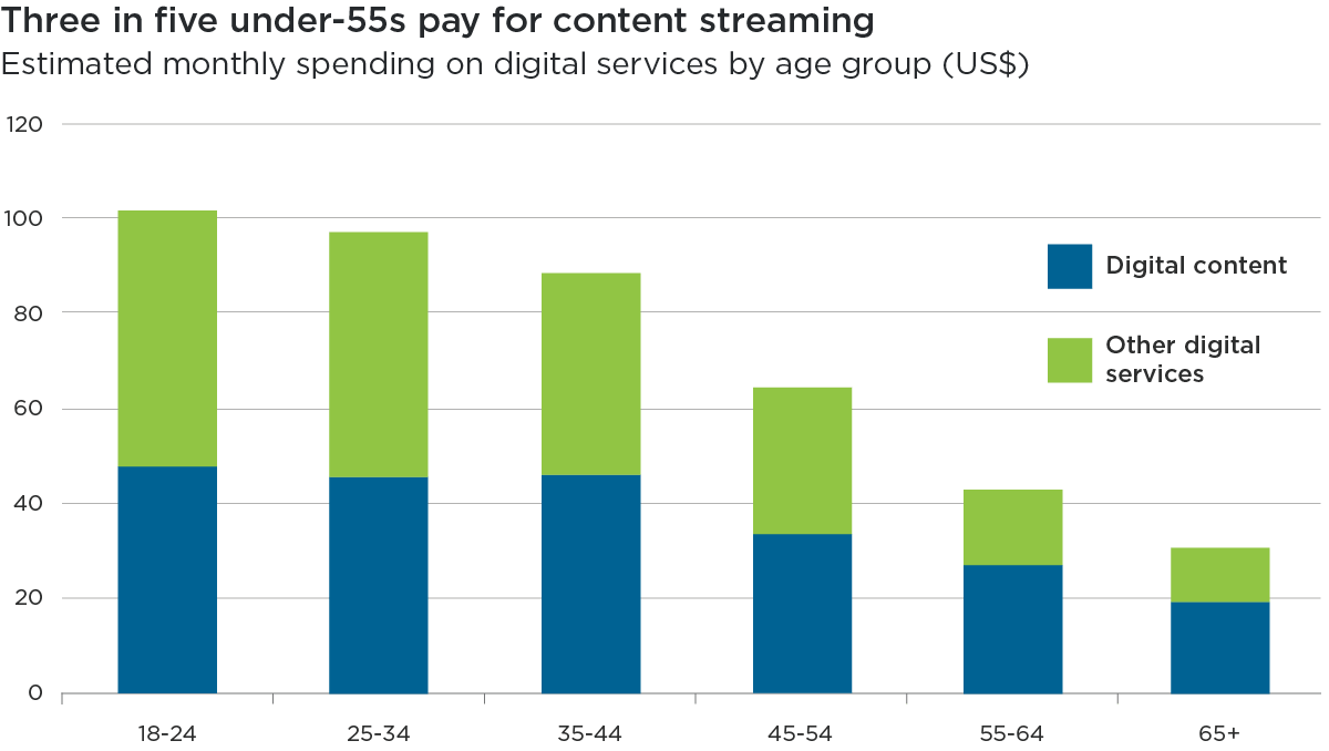 Again, it is younger consumers at the vanguard of online spending. In a global study centred on higher-income countries, 18 to 24-year-olds were found to be the highest spenders on digital services, parting with an average of US$101 a month.8
