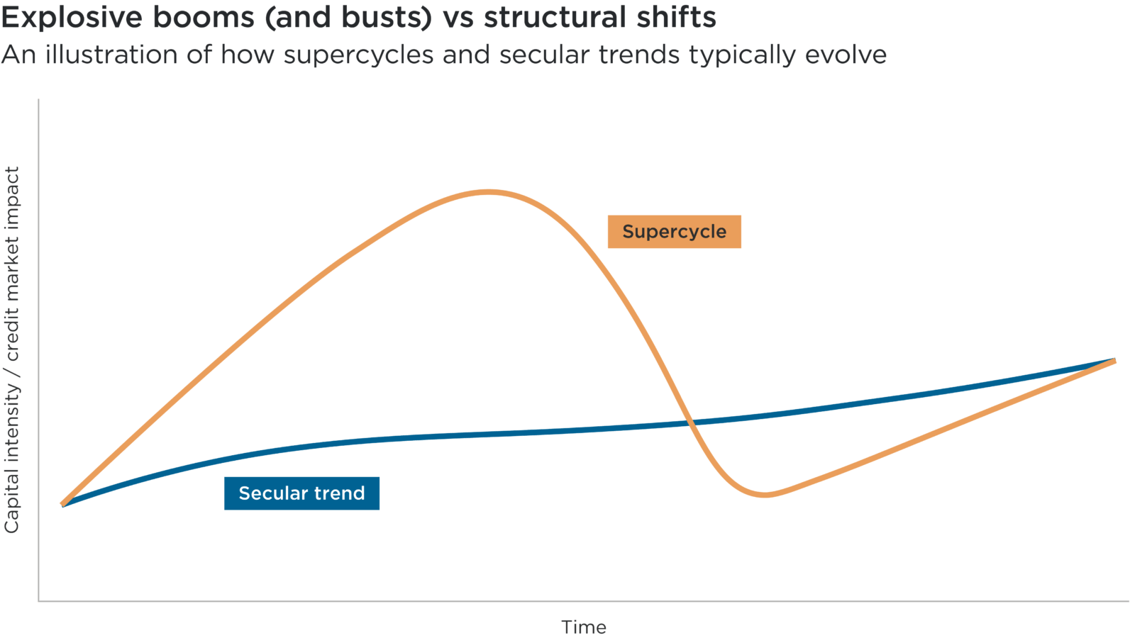 The distinction between a supercycle and a secular trend matters enormously for credit investors, particularly around the timing and magnitude of capital deployment.