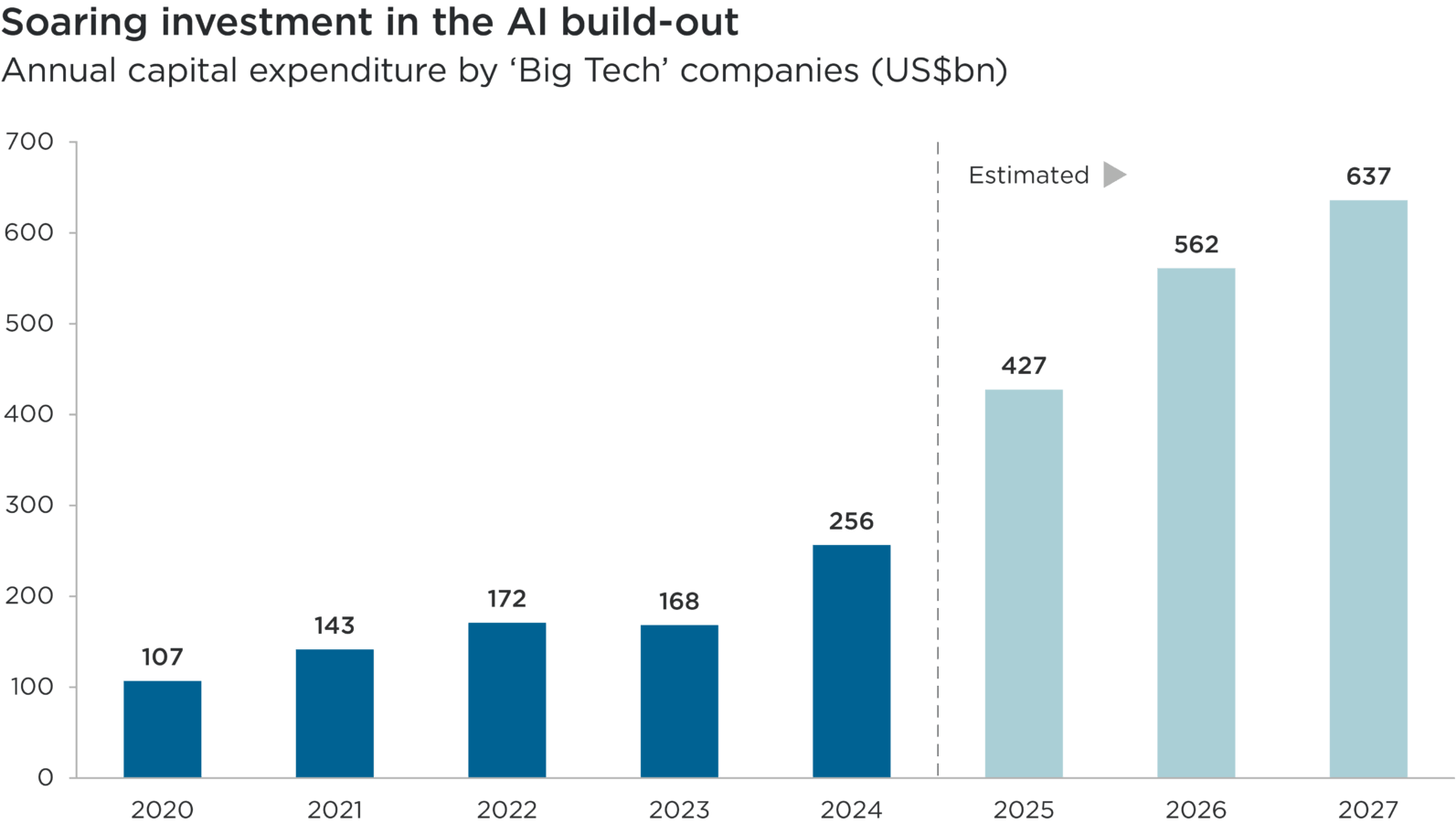 Overall, this chart illustrates how ‘Big Tech’ companies’ capex more than doubled between 2020 and 2024, and is forecast to have more than doubled again by the end of 2026. This reflects a surge in investment relating to the AI build-out.