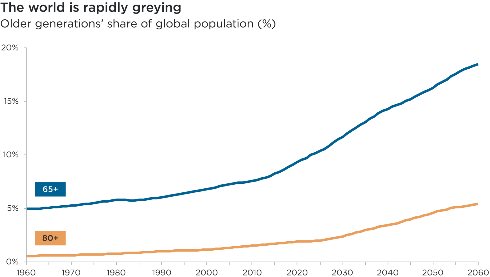 Overview: This line chart shows the percentage of the global population that is aged 65 and over (blue line) and 80 and over (orange line), respectively, since 1960. Figures from 2024 onward are estimates.