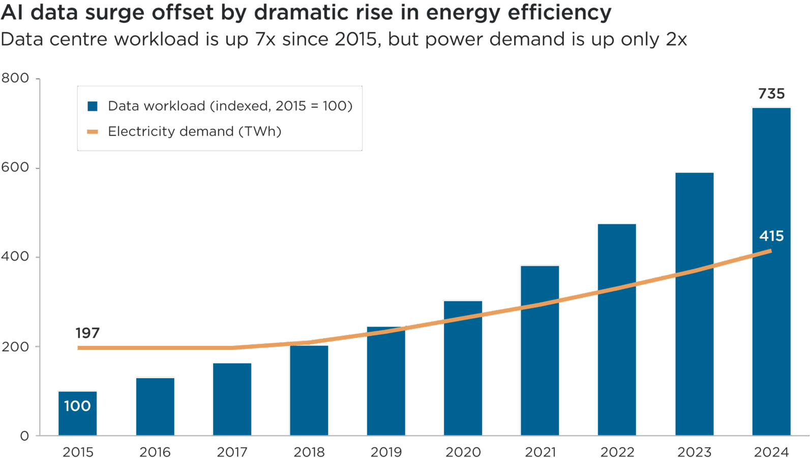Insatiable demand for AI places strain on energy and water resources, but these challenges can be managed – and, in many cases, already are. More fundamentally, the digitalisation of processes, efficient cloud computing and advanced semiconductors can combine to radically reduce the resource intensity of the global economy. We believe companies at the vanguard of innovation in these areas can present compelling long-term investment opportunities.