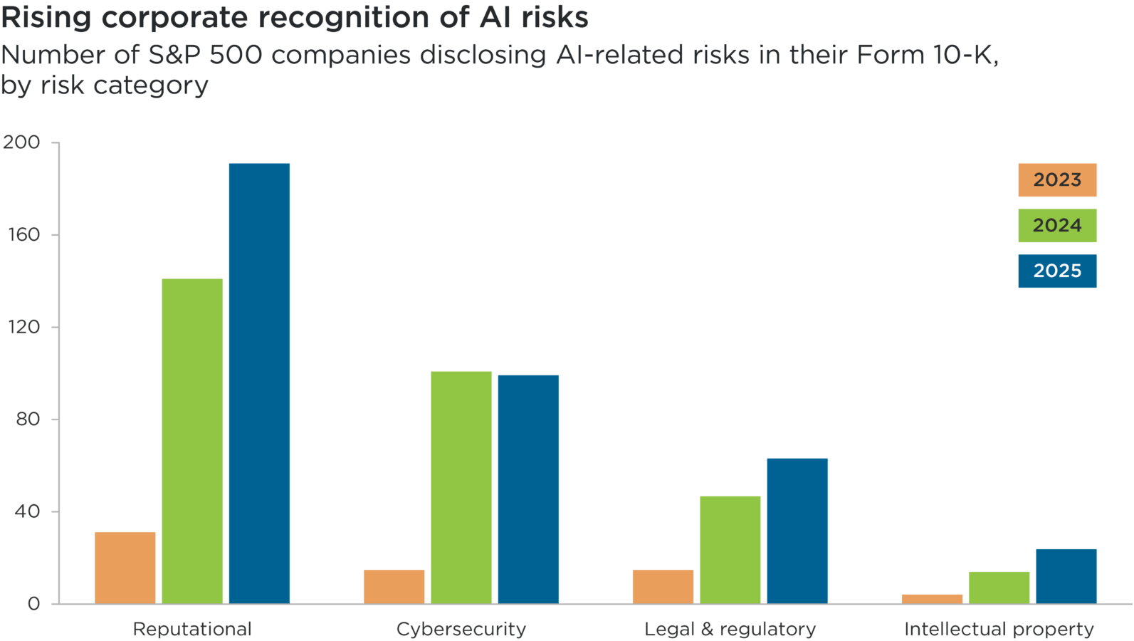 Overview: This bar chart shows the number of the largest 500 listed US companies (as comprising the S&P 500 Index) that formally disclosed specific types of AI-related risks in their reporting in 2023, 2024 and 2025. Four types of AI risks are included: reputational; cybersecurity; legal & regulatory; and intellectual property.