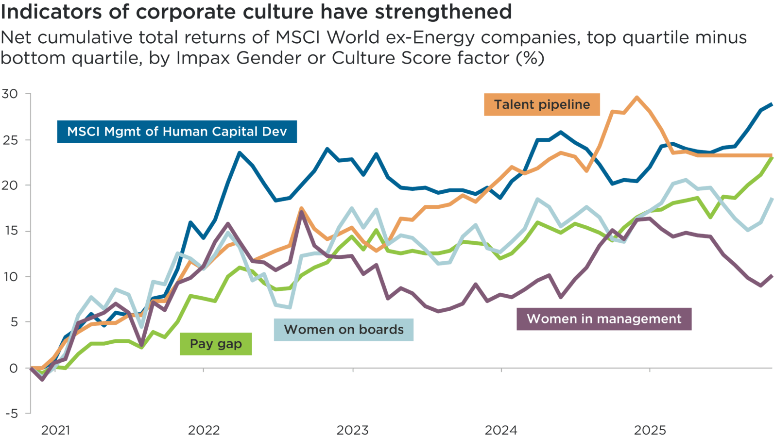 Overview: This line chart shows the outperformance of companies ranked top quartile over companies ranked bottom quartile, according to five Impax Gender or Culture Score factor respectively, over the period 2 December 2020 to 28 November 2025.