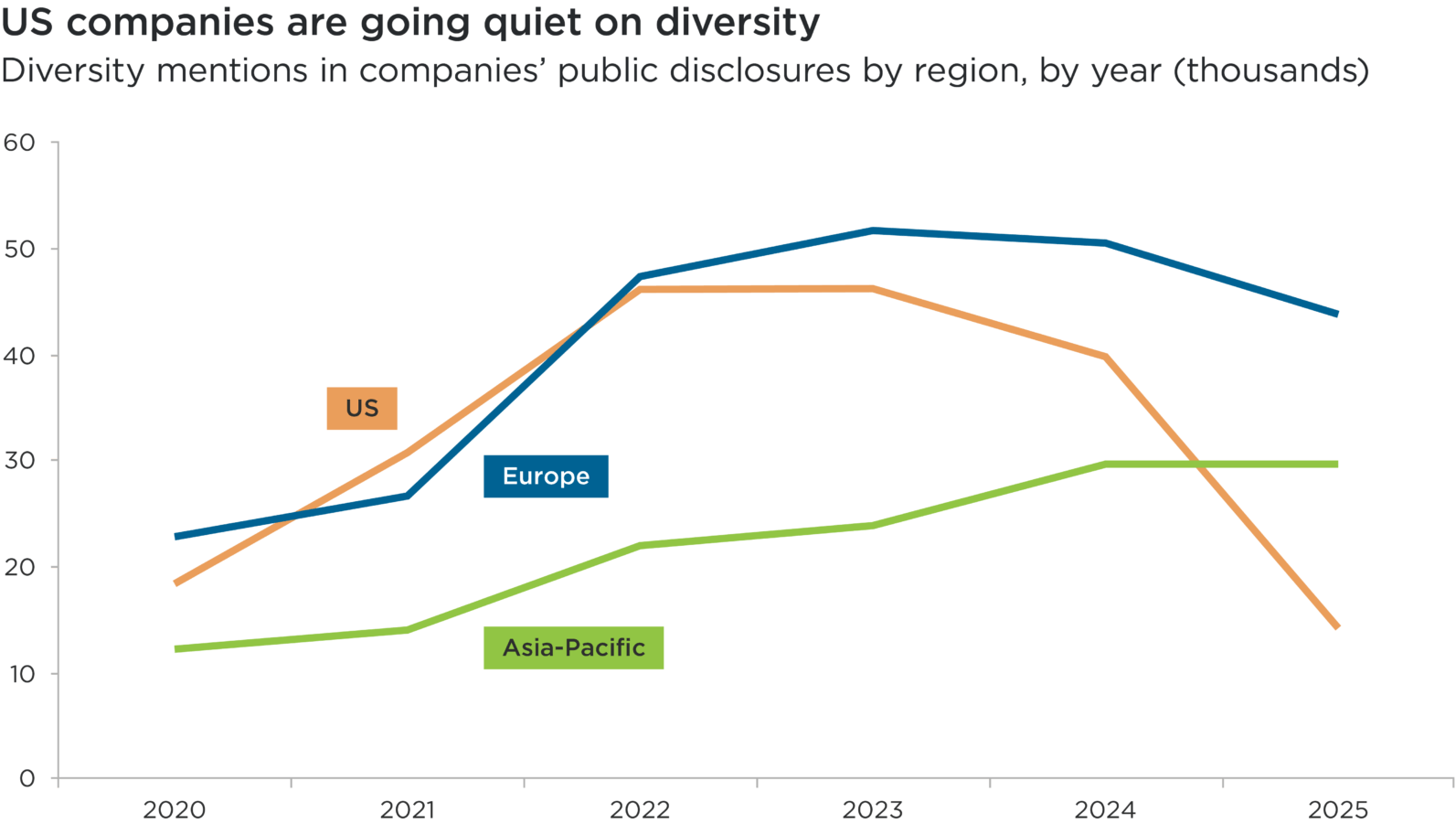 Overview: This line chart shows the number of references to ‘diversity’ in regulatory filings and earnings transcripts by larger listed companies in the US, Europe and Asia-Pacific region, by year, between 2020 and 2025.